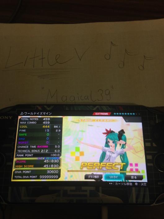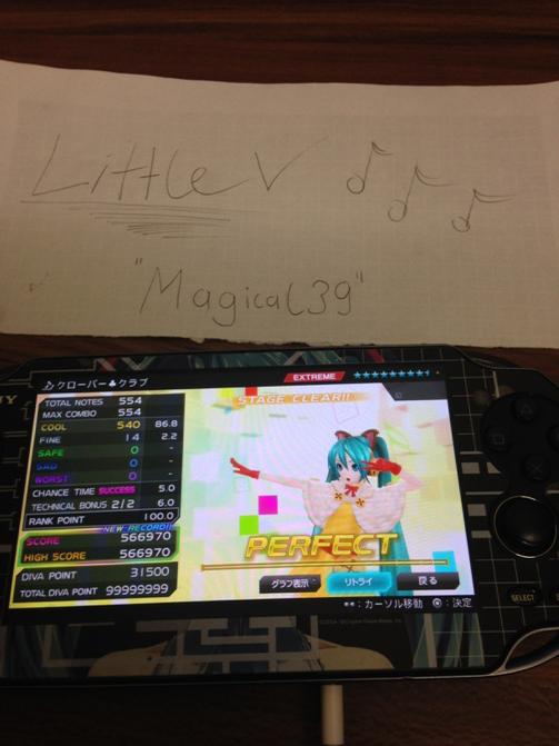 Just a couple of scores for the vita version >< The Intense Voice of Hatsune Miku HARD Spoiler Glory 3usi9 HARD Spoiler Close and Open, Demons and The Dead HARD Spoiler BEATEN: tojushiro (455670) on Glory 3usi9: HARD tojushiro (417000) on Close and Open, Demons and The Dead: HARD tojushiro (403000) on The Intense Voice of Hatsune Miku: HARD